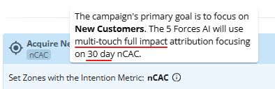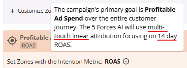 Each Intention uses a specific attribution model and date range that depends on both the Intention settings and your Sales Cycle length. Because of this, there is no single FunnelVision view that matches all 5 Forces Analysis results. Instead, use these guidelines:- For Facebook campaign analysis, 5 Forces always includes 50 percent view through conversions