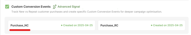 - Check the box for Custom Conversion Events (Advanced Signal) if you want events segmented by New vs. Repeat Customers or by product groups.
