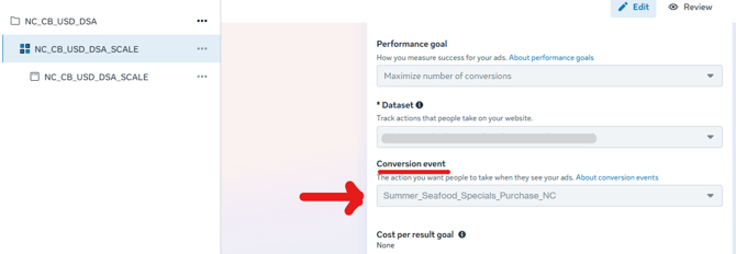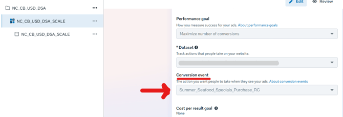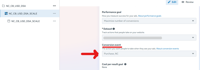 At the Ad Set level, under Conversion Event, select the New Customer Purchase event (Purchase_NC) created by Advanced Signal.