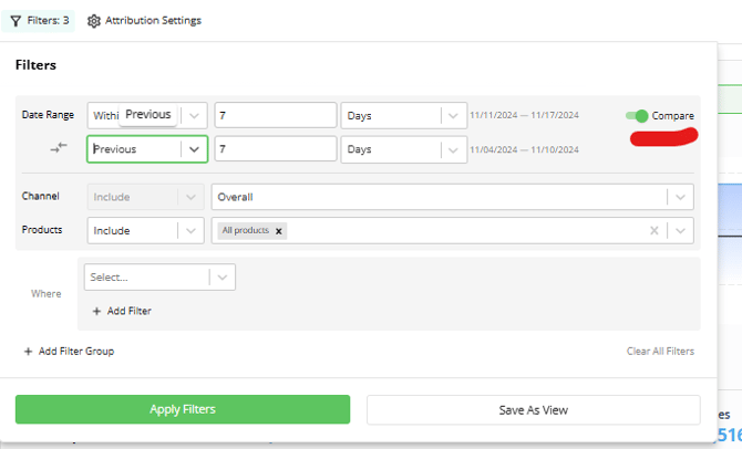 3. Select a Compare period prior to the Date Range and Apply Filters
