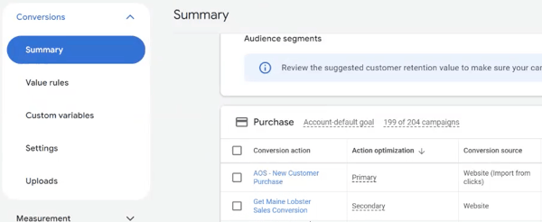In Google Ads, navigate to Goals → Conversions → Summary.
