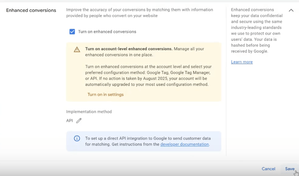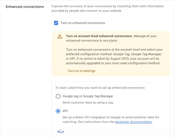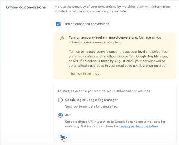 Note: If you don’t see this section, your account is likely not eligible for Enhanced Conversions. - For your Implementation method, select API & press next.