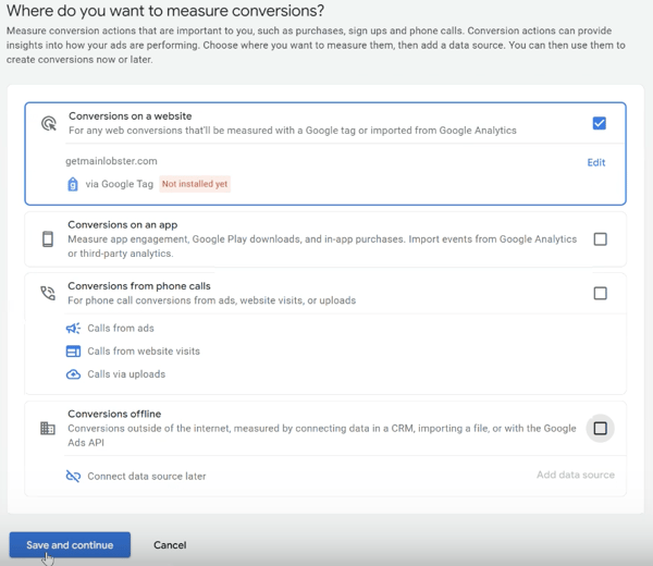 Toggle Conversions on a website to ON. Then, press Save and continue.