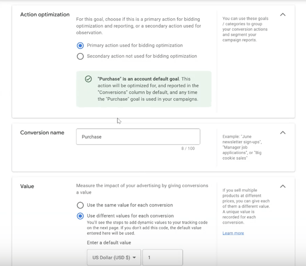 Action Optimization: Select your preference. Primary is recommend as it will actually be used by Google for optimization whereas Secondary will not be.