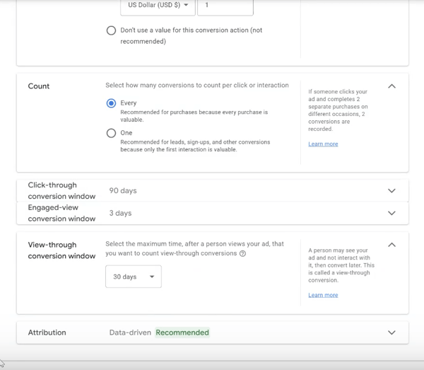 View-through conversion window: Choose a value appropriate for your sales cycle or use our recommendation of 30 days.