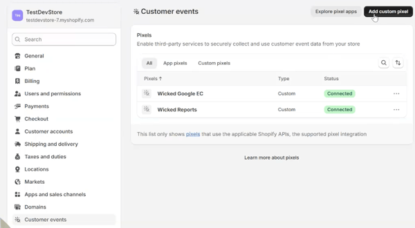 In Shopify, after updating your pixel code, return to Settings → Customer events.