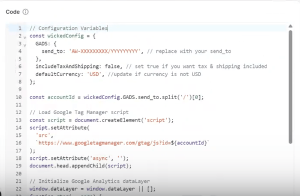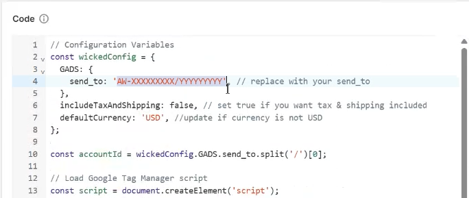 - Now, in your Shopify Pixel code, replace the placeholder 'AW-XXXXXXXXX/YYYYYYYYY' with the previously copied send_to value.