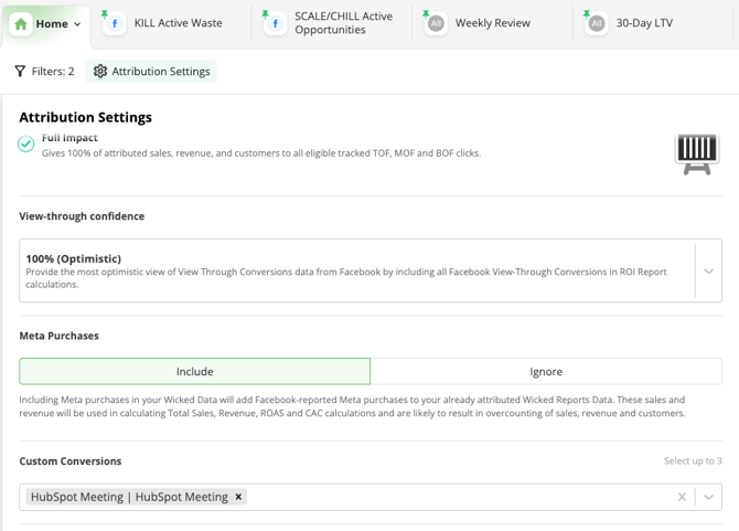 - Inside Wicked Reports, click into your Attribution Settings and select your Custom Conversions . Then, press Apply Selected Settings to save them.